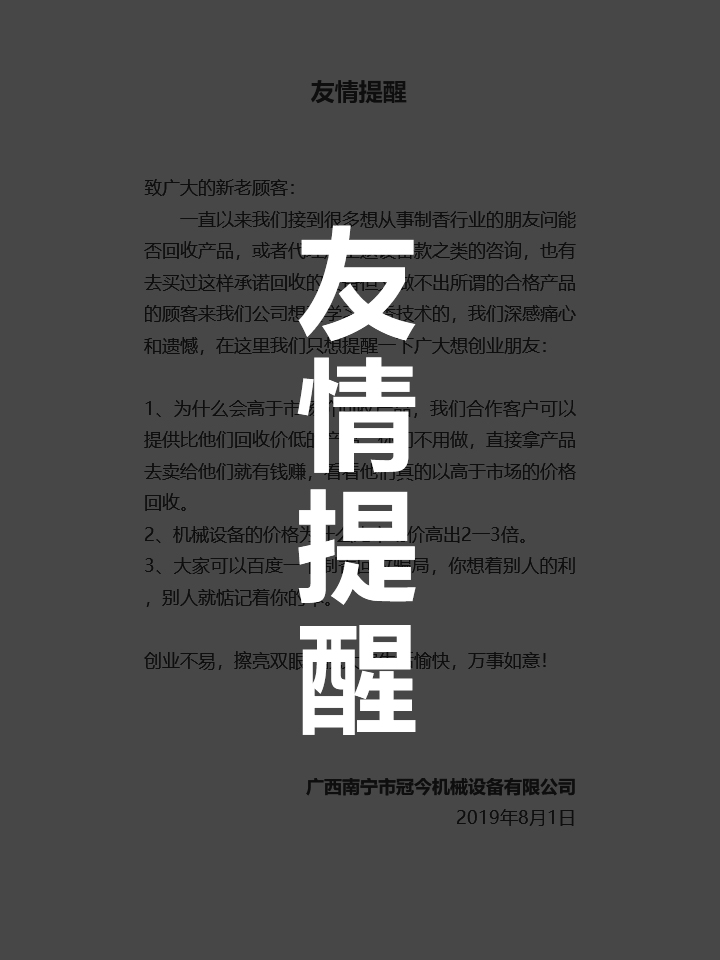 購買冠今制香機,享受八大保證,讓您創(chuàng)業(yè)無憂!冠今制香機八大支持保證系統(tǒng):強力支持 后顧無憂 1.現(xiàn)場觀摩:免費在制香廠里參觀各種香生產(chǎn)流程,滿意后再做決定。 2.專業(yè)培訓:購制香機...